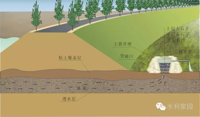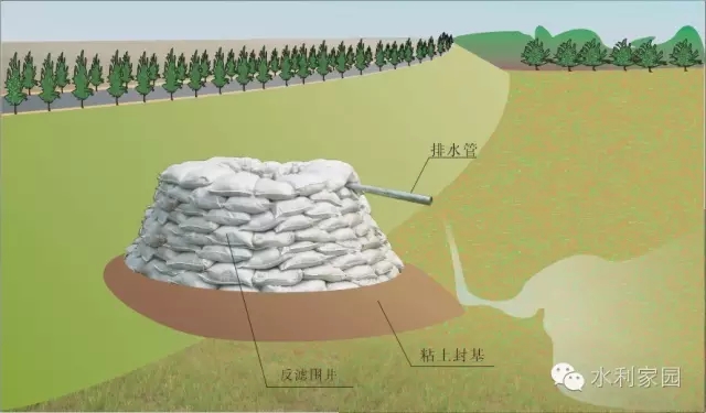 反滤围井(或背河月堤)发现漏洞后,无论进水口是否找到,均应在出水口迅速抢筑反滤围井。滤井内可填砂石或柳秸料。围井内径2~3米,井高约2米。也可抢修背河月堤,形成养水盆或在月堤内加填反滤料。
