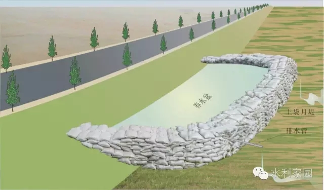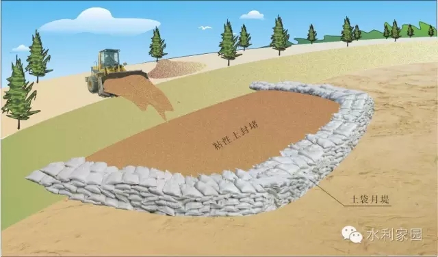 临河月堤 当临河水深较浅、流速较小、洞口在堤脚附近时,可在洞口外侧用土袋迅速抢筑月形围埝,圈围洞口,同时在围埝内快速抛填粘性土,封堵洞口。