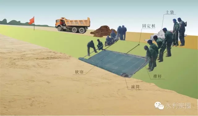 软帘盖堵 知道漏洞进口大致位置且附近堤坡无树木杂物时,可用软帘盖堵。软帘可用复合土工膜或篷布制作。软帘应自临河堤肩顺坡铺放,然后抛压土袋,再填土筑戗。