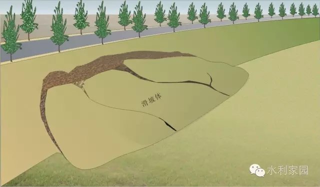 滑坡险情 堤防滑坡又称脱坡,一般是由于水流淘刷、内部渗水作用或上部压载所造成。滑坡后堤身断面变窄,水流渗径变短,易诱发其它险情。险情发现后,应查明原因,及时抢护。