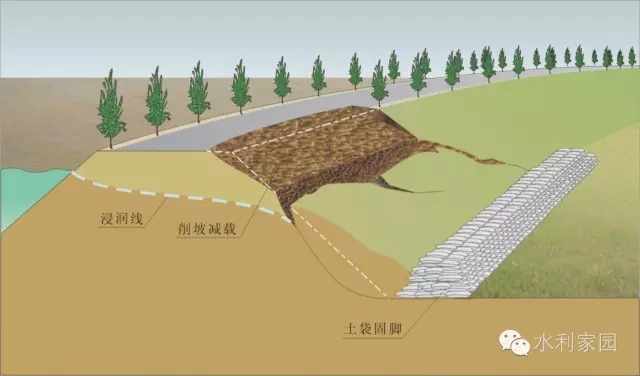 固脚阻滑 背河滑坡时,将土袋、块石、铅丝笼等重物堆放在滑坡体下部,使其起阻止继续下滑和固脚的双重作用。同时移走滑动面上部和堤顶的重物,并削缓陡坡。