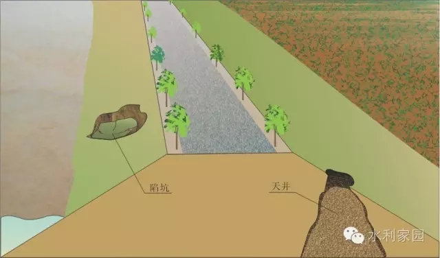 陷坑险情 陷坑又称跌窝,是指在洪水期或大雨时,堤身发生的局部塌陷。有的口大底浅呈盆形,有的口小底深呈井形。无论陷坑发生在何处,都必须查明原因,及时进行抢护。