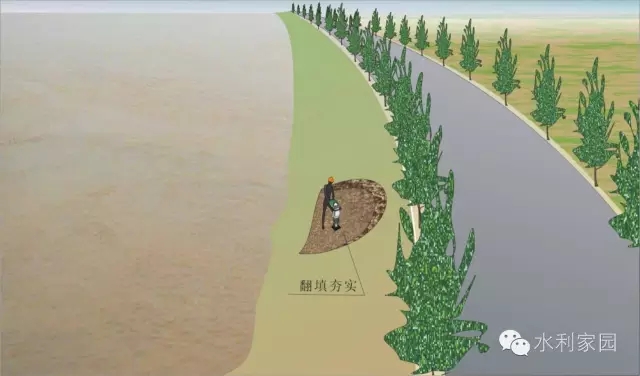 翻填夯实 凡是条件许可,陷坑内又未伴随渗水、管涌或漏洞等险情的情况下,均可采用此法。具体作法:先将陷坑内的松土翻出,然后分层回填夯实,恢复堤防原貌。