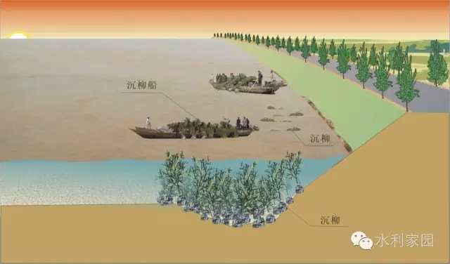 沉柳缓流防冲 适用于水深溜缓的险情。采用枝叶茂密的柳树头,捆扎大块石等重物,顺堤从下游向上游,依次抛沉。水浅溜缓时可改为土工织物上压土袋或挂柳防冲等措施。
