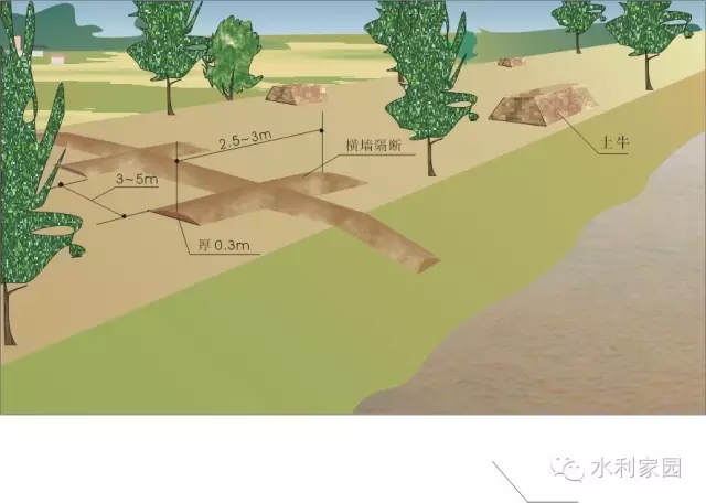 横墙隔断 适用于横向裂缝抢险。除沿裂缝方向开挖沟槽外,还每隔3~5米开挖一条横向沟槽,沟槽内用粘土分层回填夯实。如裂缝已与河水相通,开挖沟槽前,应采取前戗等截流措施。
