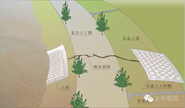 土工膜盖堵 当河水可能侵入缝内时,可将复合土工膜(一布一膜)在临水坡裂缝处全面铺设,并在其上压盖土袋,使裂缝与水隔离,起到截渗作用。同时,在背水堤坡铺设反滤土工织物,上压土袋,然后再采用横墙隔断法处理。