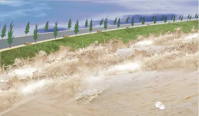 风浪险情 汛期河水上涨,水面变宽。当风速较大时,风浪对堤防冲击力强,轻者造成堤坡坍塌变陡,重者出现滑坡、漫溢等险情,甚至造成决口,应因地制宜,采取具体抢护措施。
