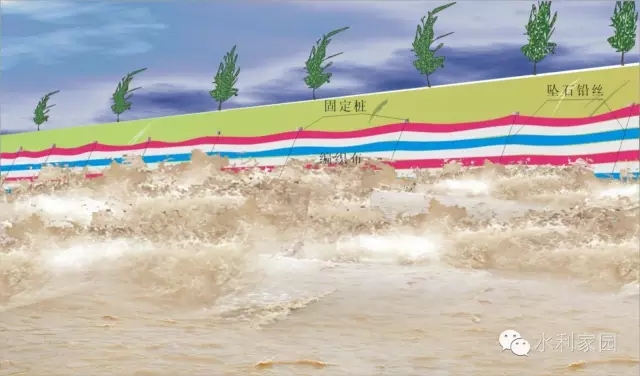 土工织物防浪 此法防浪效果好,宜优先选用。将编织布铺放在堤坡上,顶部用木桩固定并高出洪水位1.5~2米。另外用铅丝或绳一端固定在木桩上,一端拴石或土袋坠压于水下,以防漂浮。