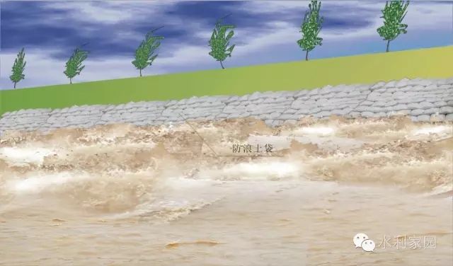 土袋防浪 此法适用于风浪破坏已经发生的堤段,用编织袋、麻袋装土(或砂或碎石或砖等),叠放在迎水堤坡。土袋应排挤紧密,上下错缝。