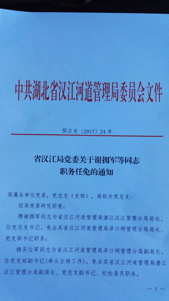 省汉江局党委关于谢拥军等同志职务任免的通知