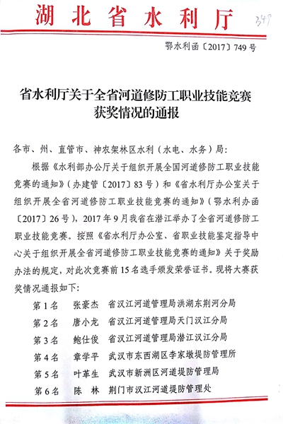 省水利厅关于全省河道修防工职业技能竞赛获奖情况的通报