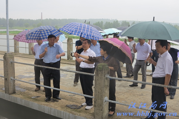 (邹琴)7月5日上午,省委常委、宣传部部长梁伟年冒着大雨检查指导杜家台闸防汛工作。省水利厅党组成员、副厅长唐俊,省委宣传部秘书长胡和平,仙桃市委副书记、市长周文霞,省汉江局局长李洪兵等领导陪同检查。