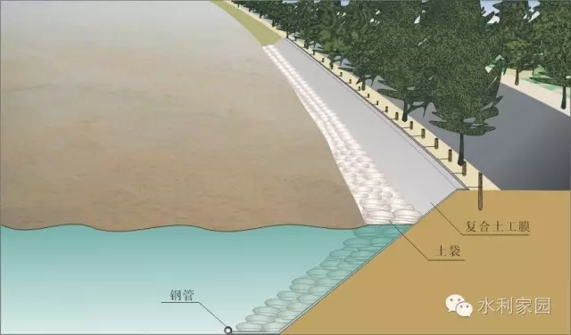 土工膜截渗 临水堤坡较平整时,采用土工膜截渗。将直径4~5厘米的钢管固定在土工膜的下端,卷好后将上端系于堤顶木桩上,沿堤坡滚下,并在其上压盖土袋。