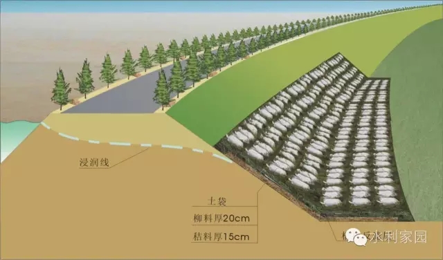 沉柳缓流防 适用于水深溜缓的险情。采用枝叶茂密的柳树头,捆扎大块石等重物,顺堤从下游向上游,依次抛沉。水浅溜缓时可改为土工织物上压土袋或挂柳防冲等措施。
