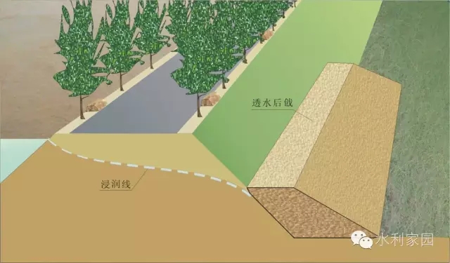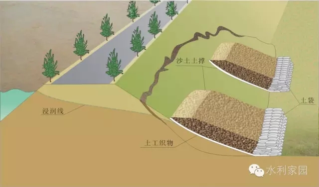 透水后戗 坡渗水严重,沙土料源丰富,施工机具充足,可抢筑透水后戗。抢筑前,清除地表杂物。戗顶一般高出浸润线出逸点0.5~1米、顶宽2~4米,戗坡1:3~1:5,长度超过渗水堤段两端各5米。