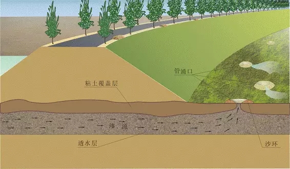 管涌险情 管涌多发生在背河坡脚附近地面及坑塘中。汛期高水位时,在渗透压力作用下土中的细颗粒被水带出,落于孔口周围形成沙环。发现管涌险情后,应及时抢护。