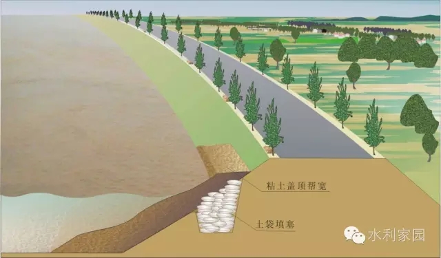 填塞封堵 适用于临水坡水下部位的陷坑。先用土工编织袋、草袋或麻袋装粘性土料,直接向水下填塞陷坑,填满后再抛投粘性散土加以封堵和帮宽。要求封堵严密,避免从陷坑处形成漏洞。