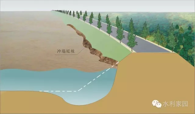 冲塌险情 顺堤行洪走溜,水流淘刷堤脚,造成堤坡失稳坍塌的险情。该险情一般长度大、坍塌快,如不及时抢护,将会冲决堤防。水深溜急坍塌长的堤段,应采用垛或短丁坝群导溜外移,保护堤防,其它冲塌险情可按缓流固脚原则抢护。