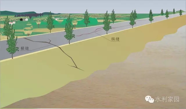 裂缝险情 堤防裂缝是常见的一种险情,常是其它险情的预兆,危害较大的有横向裂缝和纵向裂缝。横向裂缝一经发现必须迅速抢护。纵向裂缝要专人观测和维护,对发展较快的要采取抢护措施。