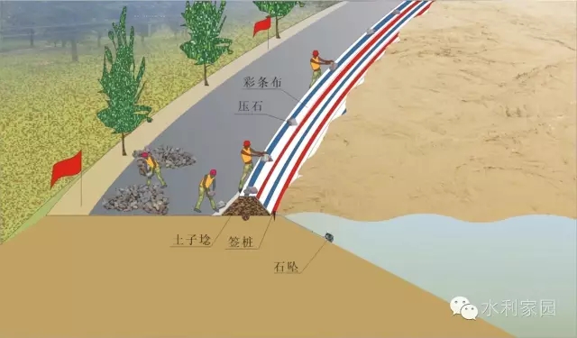 土工织物子埝 适用于土料充足、运输有保障的情况。先在距临水堤肩0.5~1米处抢筑土埝,然后用彩条布或土工膜将其包盖,用签桩石坠固定,以防渗抗冲。