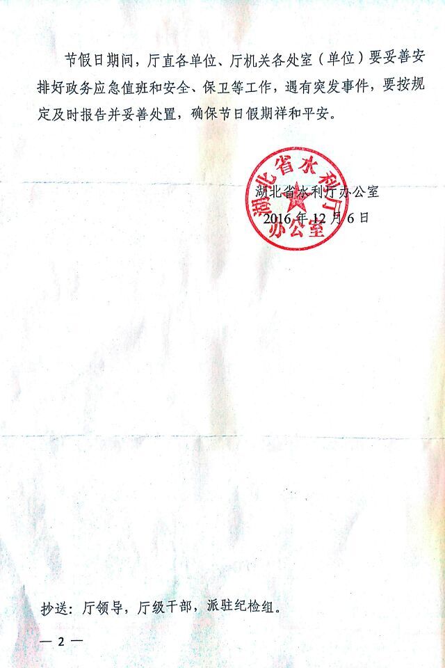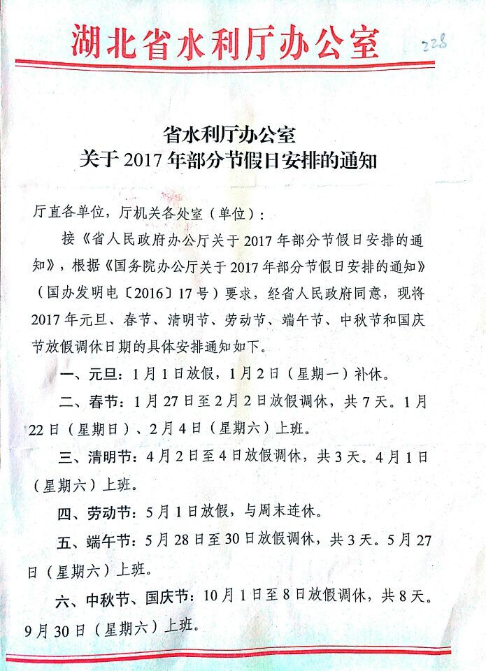 根据《省水利厅办公室关于2017年部分节假日安排的通知》要求,现将2017年部分节假日放假调休日期安排通知转发给你们,请各单位在节假日期间,妥善安排好政务应急值班和安全、保卫等工作,确保节日假期祥和平安。