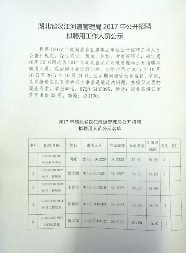 省汉江局2017年拟聘人员公示